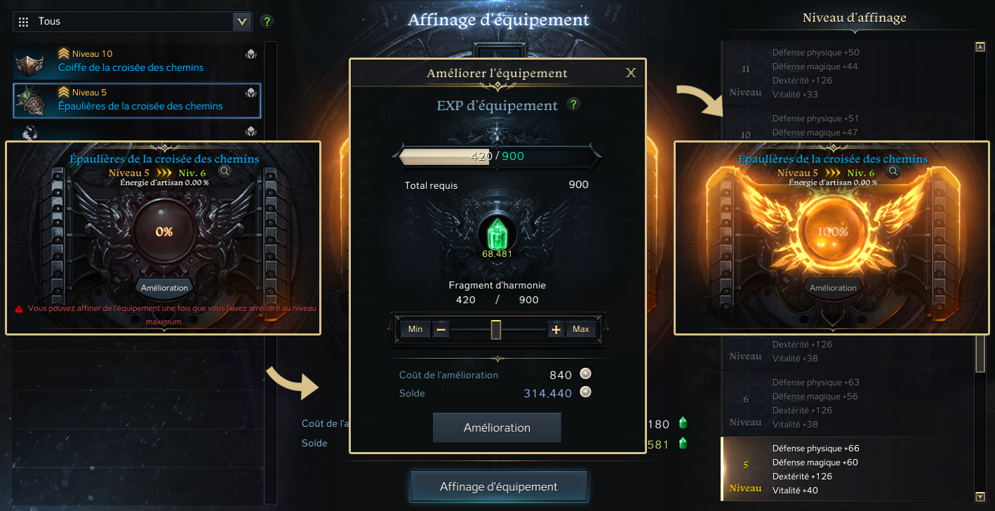 - Amélioration de l’équipement : amélioration d’un équipement en consommant des « Fragments ». Processus préalable et nécessaire à l’affinage.