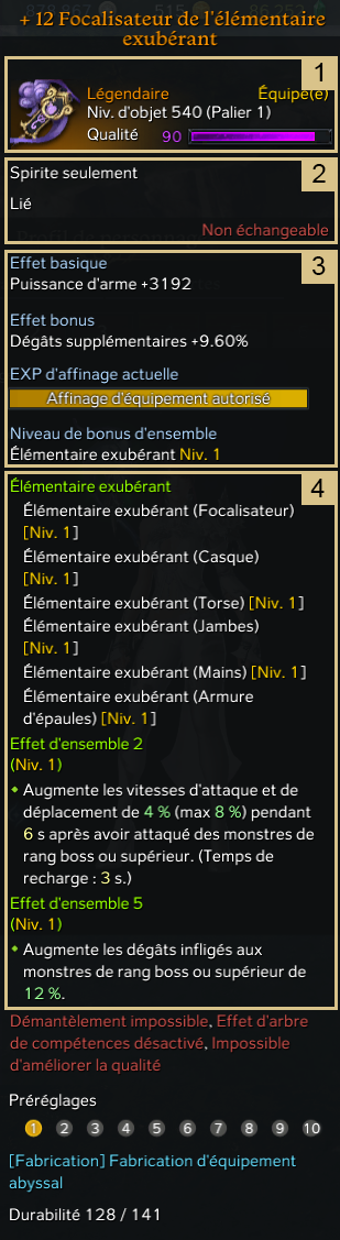 - Certains équipements font partie d’un ensemble, ils offrent des statistiques ou des améliorations supplémentaires si vous équipez un certain nombre de ces équipements.