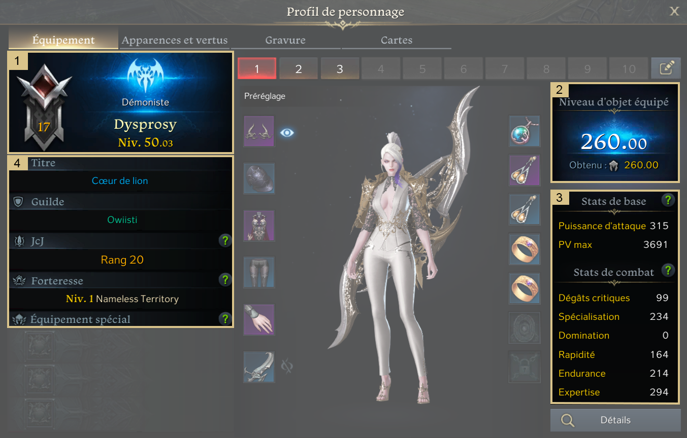 - Titre, Guilde, Classement PVP, Forteresse, Équipement spécial, etc.