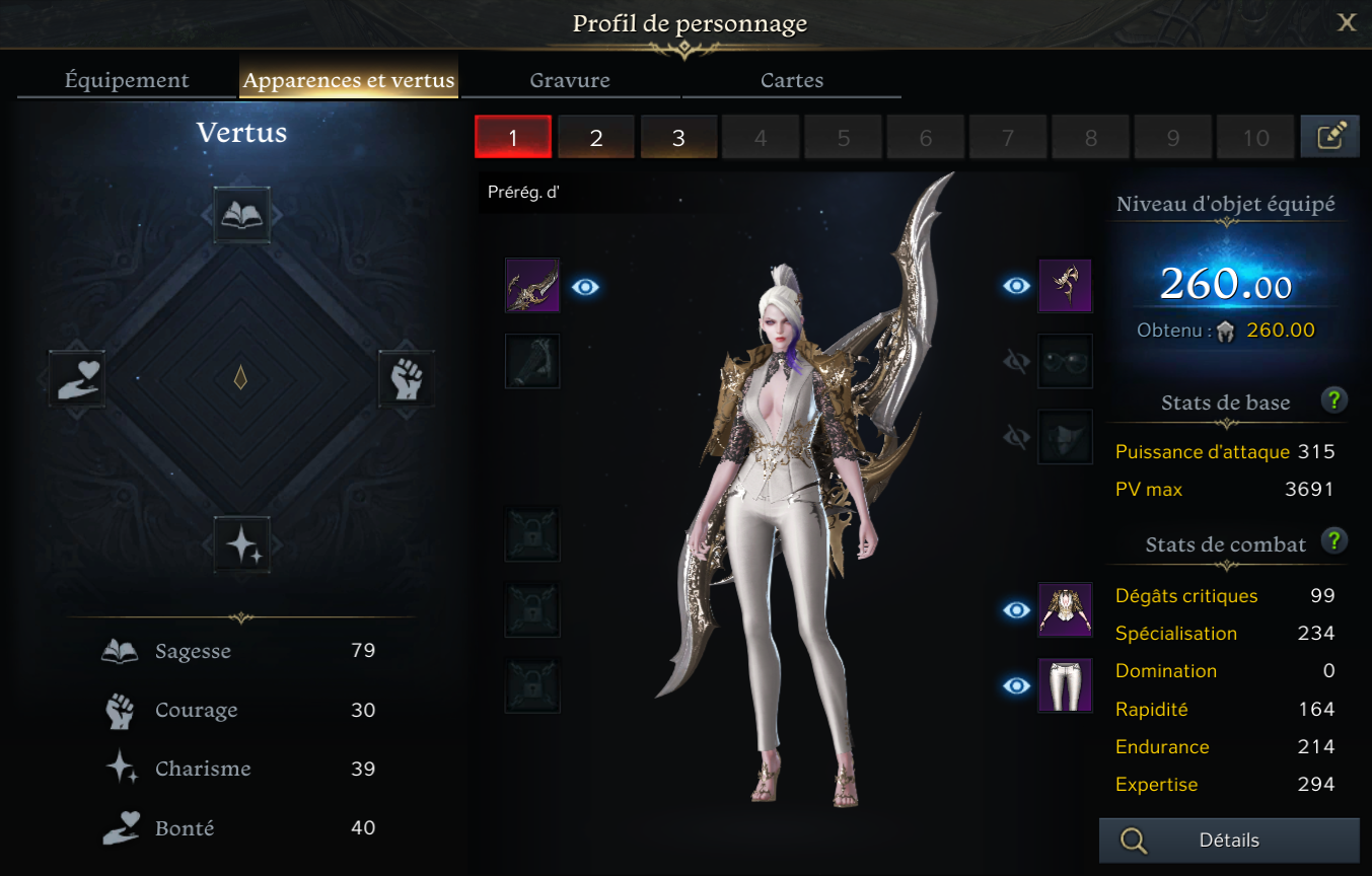 Vous pouvez voir les apparences et les vertus du personnage.