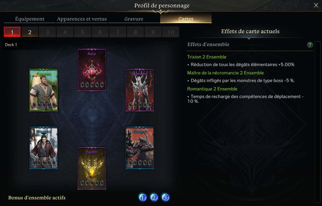 Les préréglages de cartes définis pour le personnage et les effets de celles équipées sont uniquement consultables via cet onglet.