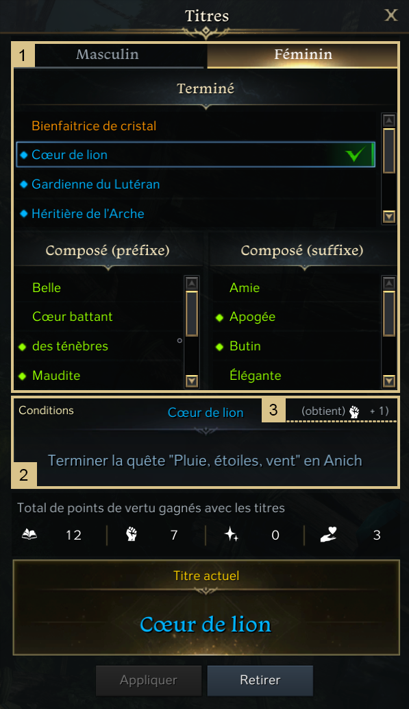 - Les points de vertus obtenus par l’acquisition d’un titre sont ajoutés aux statistiques du personnage, sans nécessité de le porter. Les points cumulés par ce dernier peuvent être trouvés dans la fenêtre du titre.