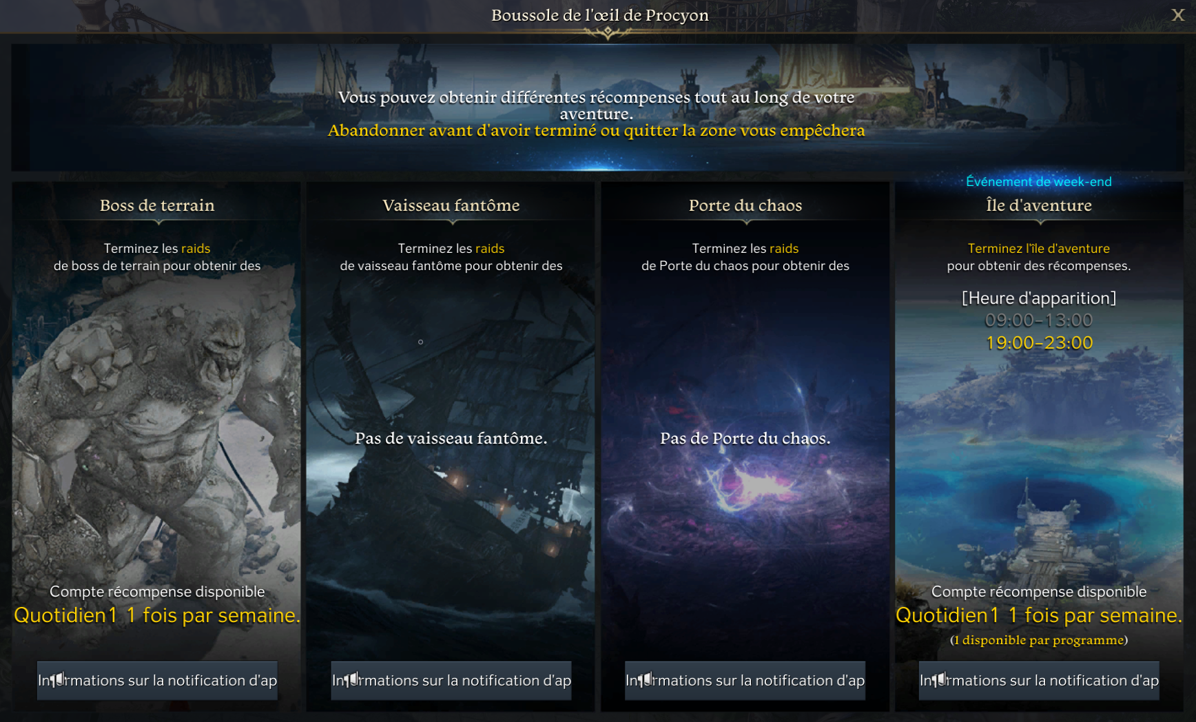 - Au total, 4 types de contenu peuvent être consultés dans la boussole de l’œil de Procyon : les Boss de zones, les Navires fantômes, les Portes du chaos et les Îles d’aventures.