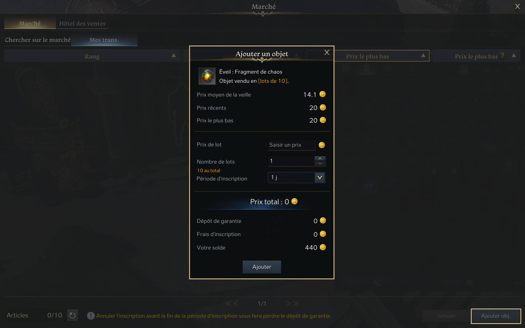 Cependant, certains objets ont un nombre maximum de transactions. Ces objets ne peuvent pas être mis à l’hôtel des ventes s’ils sont inférieurs au niveau de limite de transaction.