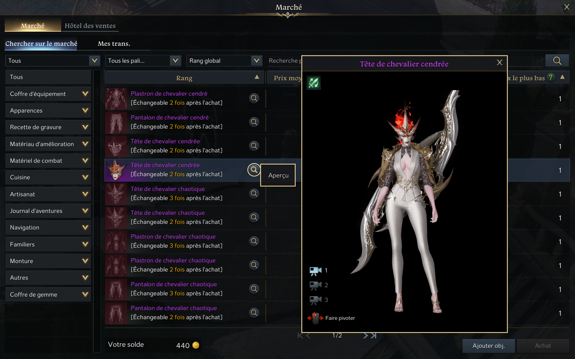 Si l’élément que vous avez recherché ou sélectionné est une pièce d’équipement cosmétique, vous pouvez également cliquer sur le bouton de la loupe pour vérifier à l’avance l’apparence de l’objet sur votre personnage.