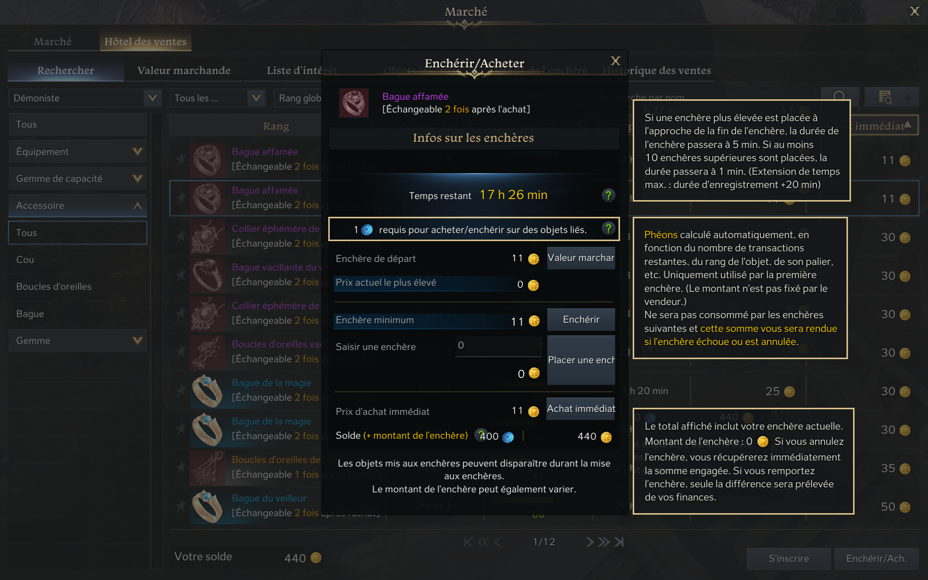 ※ Cependant, si vous perdez l’enchère et que l’objet est acquis par un autre aventurier, le phéon sera consommé.