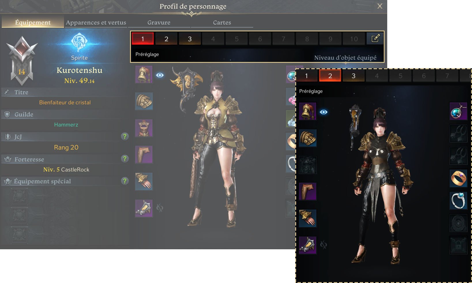 Les préréglages d’équipements référencent et stockent les informations de ceux portés dans la fenêtre d’information du personnage [P].