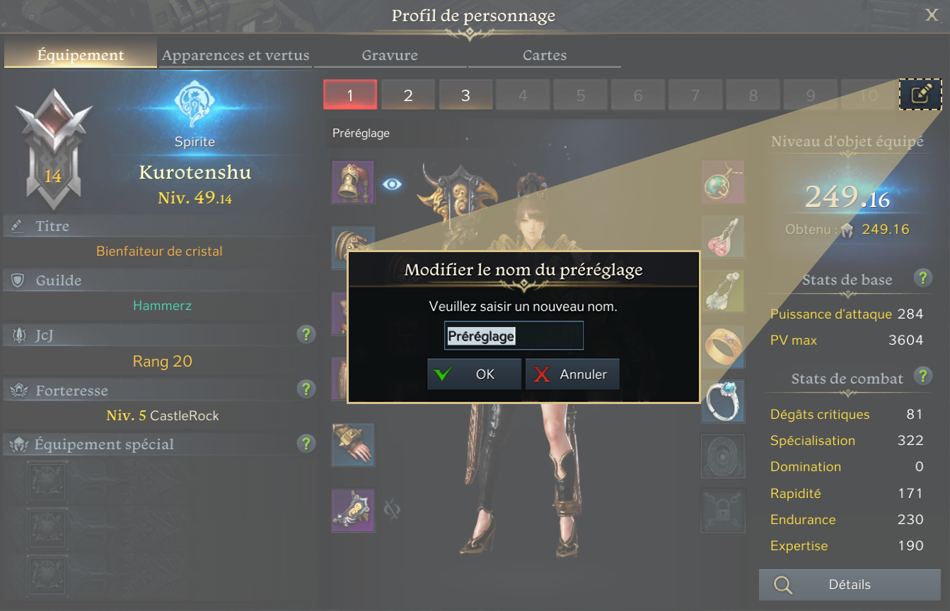 En cliquant sur le bouton « Renommer le préréglage » tout à droite, vous pourrez changer le nom du préréglage d’équipement.