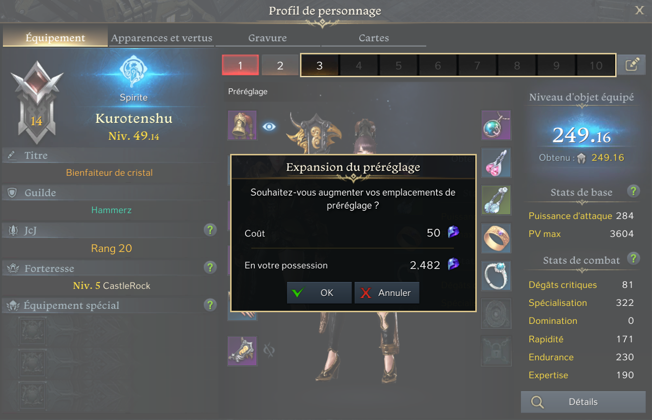 Lors de l’utilisation d’un préréglage, les équipements stockés sont automatiquement équipés par le personnage et les équipements remplacés sont alors stockés à leur tour.