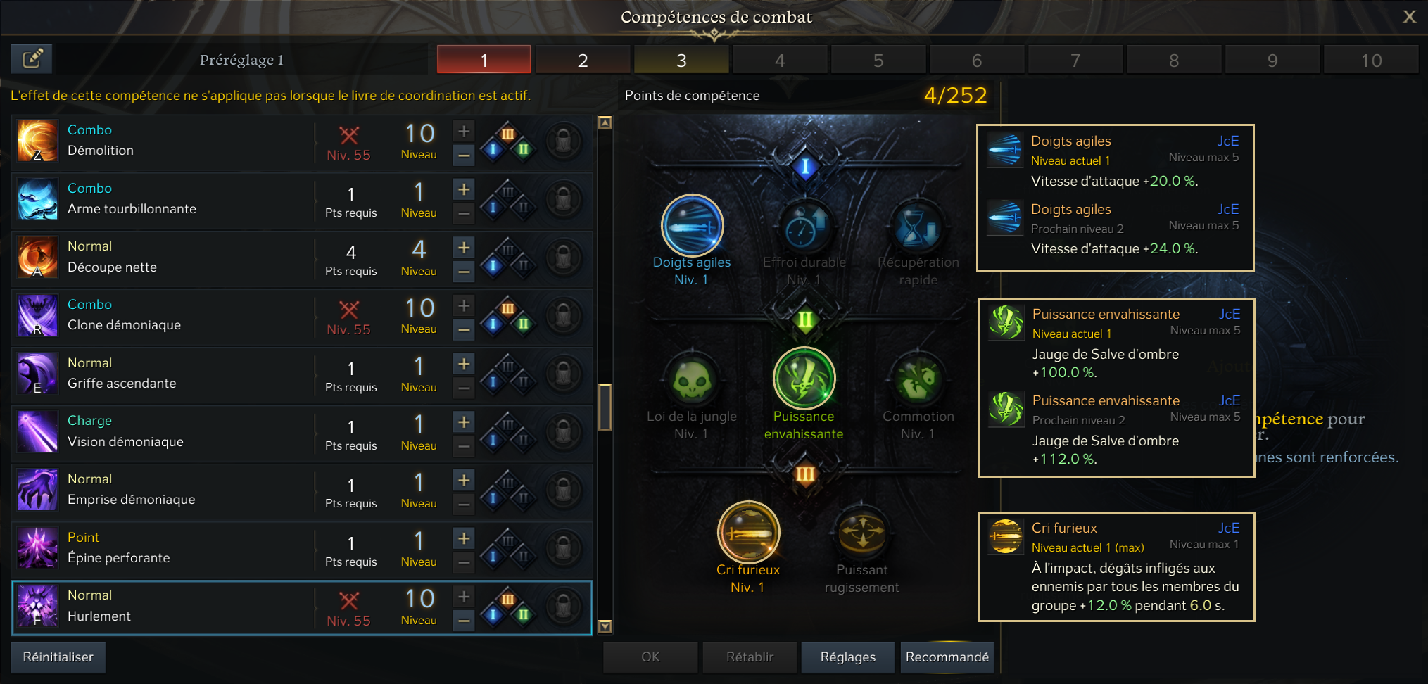 En fonction de la situation et du contenu, vous pouvez être amené à faire évoluer votre style de jeu et changer vos compétences et leurs tripods. Ces changements peuvent être gérés plus facilement grâce aux [Préréglages de compétences].