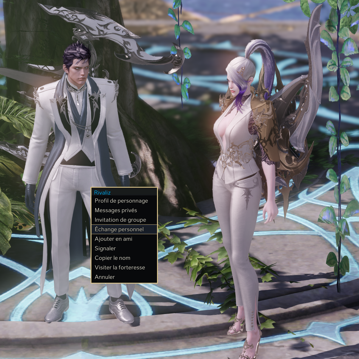 - Vous pouvez demander un échange avec un joueur via le bouton [Échange personnel] du menu du joueur, accessible en cliquant sur le personnage cible avec [Ctrl] + [Clic droit].