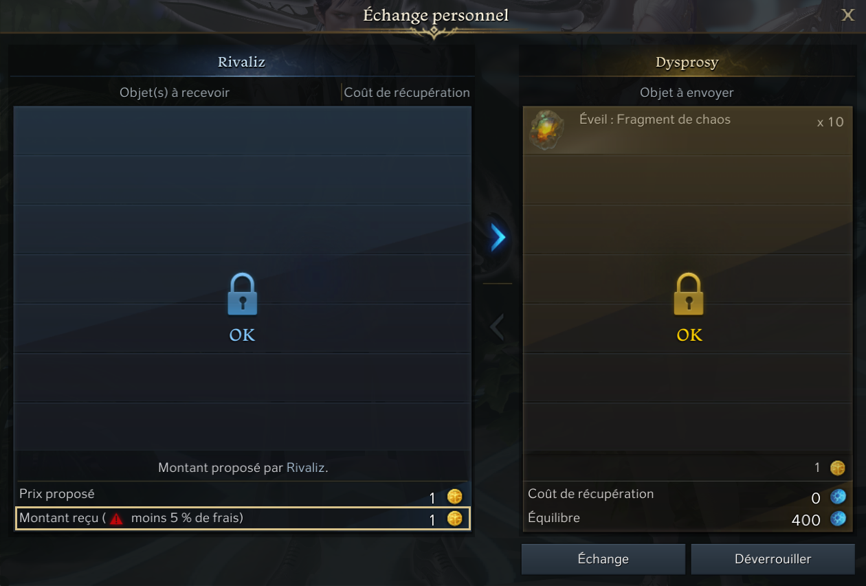 - [Échange] : cliquez sur le bouton [Échange] pour le confirmer. Il s’effectue lorsque les deux joueurs cliquent sur le bouton [Échange]. Soyez particulièrement attentif avant de le confirmer.