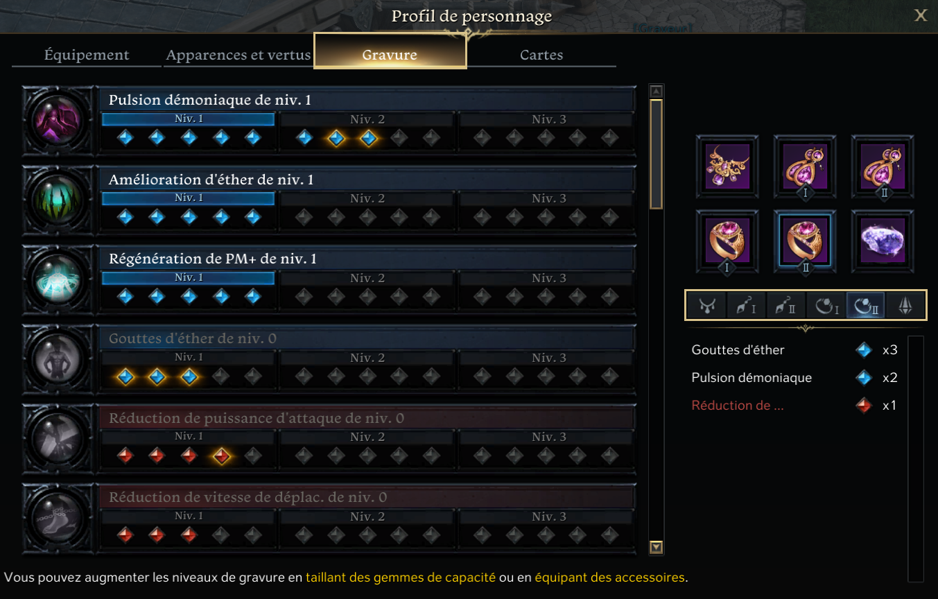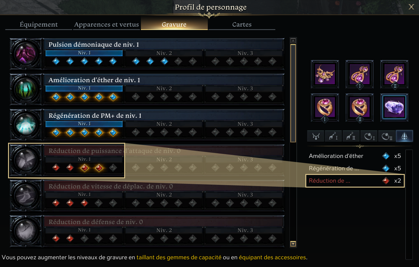 Les points de gravure sont attribués aux accessoires et aux gemmes de capacités.