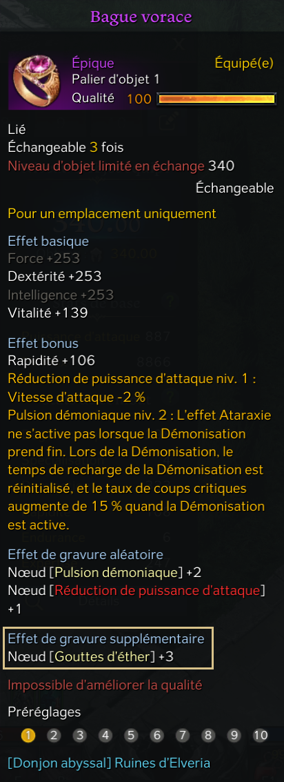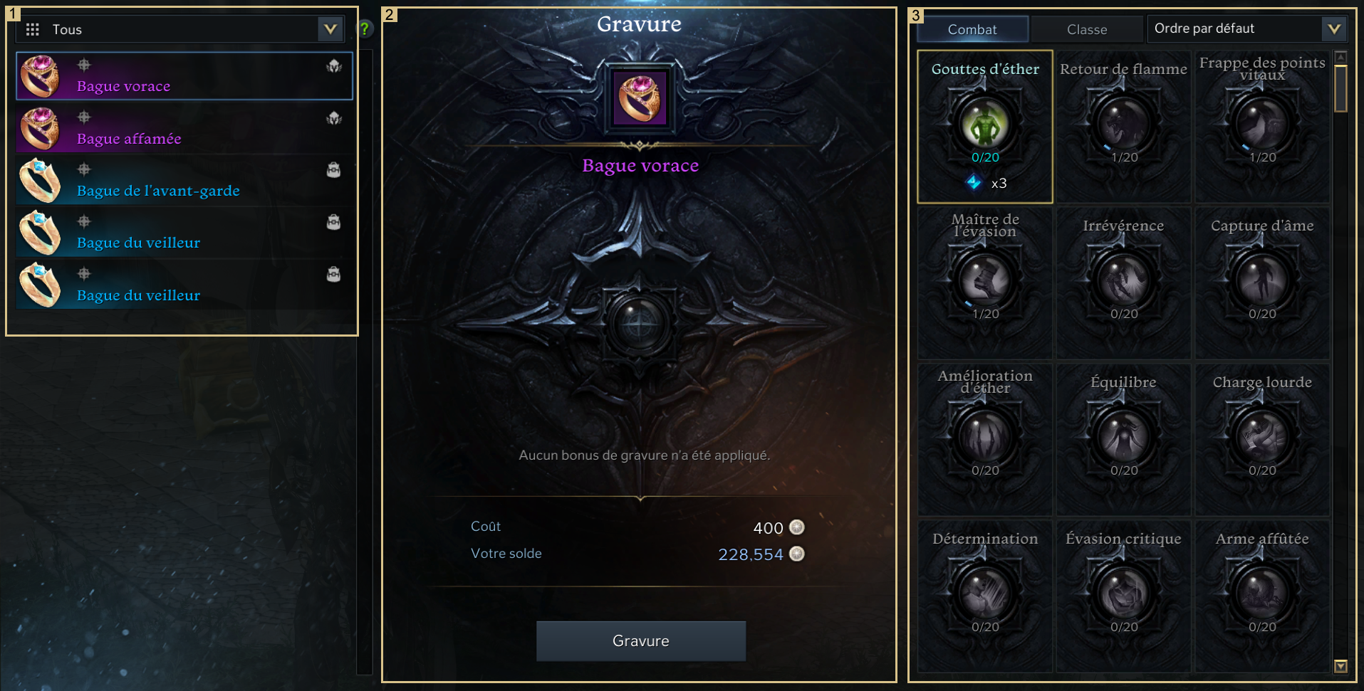 Vous pouvez activer l’effet de gravure en additionnant les points d’activation de gravure indiqués dans les accessoires et les gemmes de capacités que vous équipez.