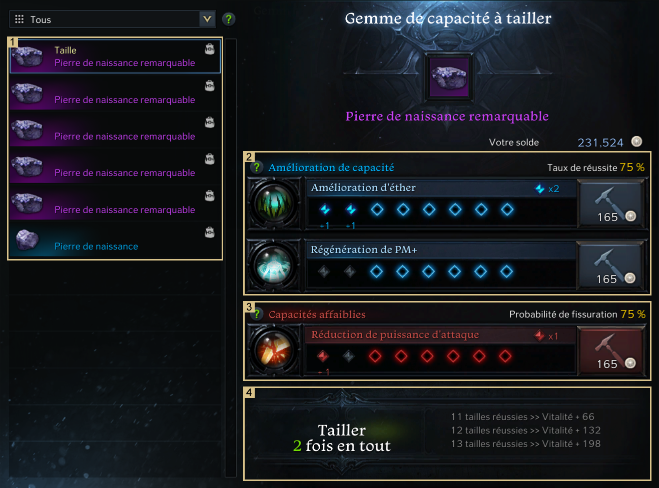 - Les gemmes de capacités en cours de polissage auront un statut affiché séparément.