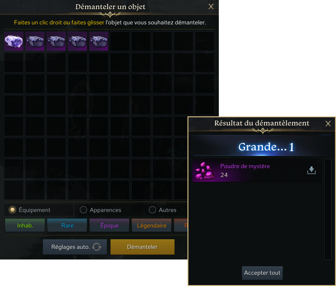 Vous pouvez acquérir des objets avec des effets de gravure ou collecter des gravures et les attribuer à vos accessoires.