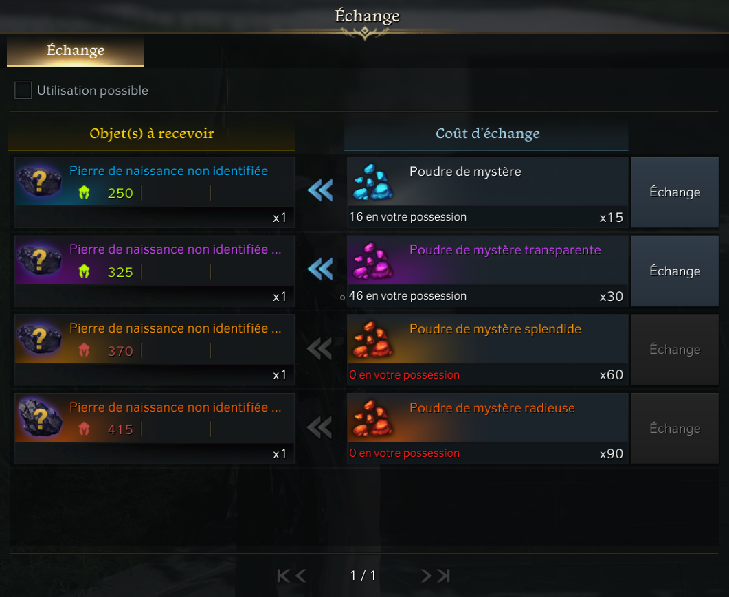 - Les matériaux obtenus peuvent être transformés en gemmes de capacités par échange avec le PNJ [Lapidaire des gemmes de capacités].