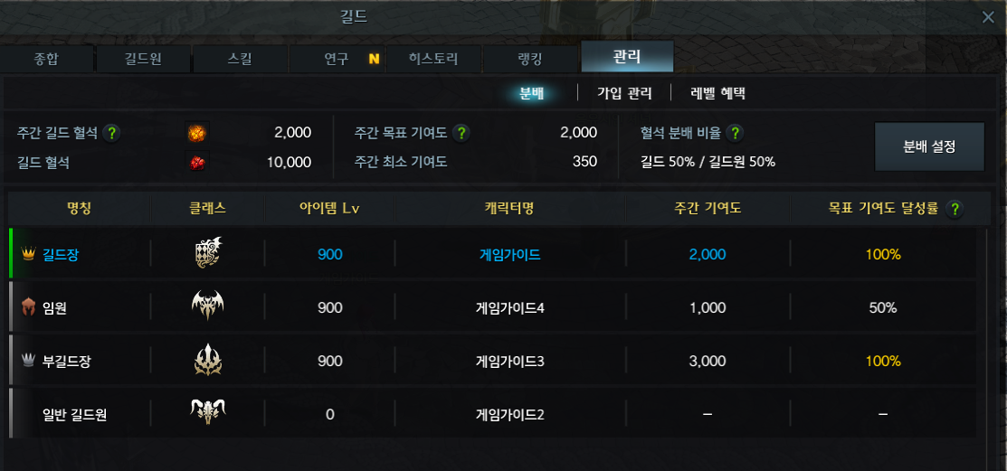 Dans l’image ci-dessus, les Pierres de sang de guilde hebdomadaires obtenues par la guilde sont de 2000 et le taux de distribution est de 50%.
