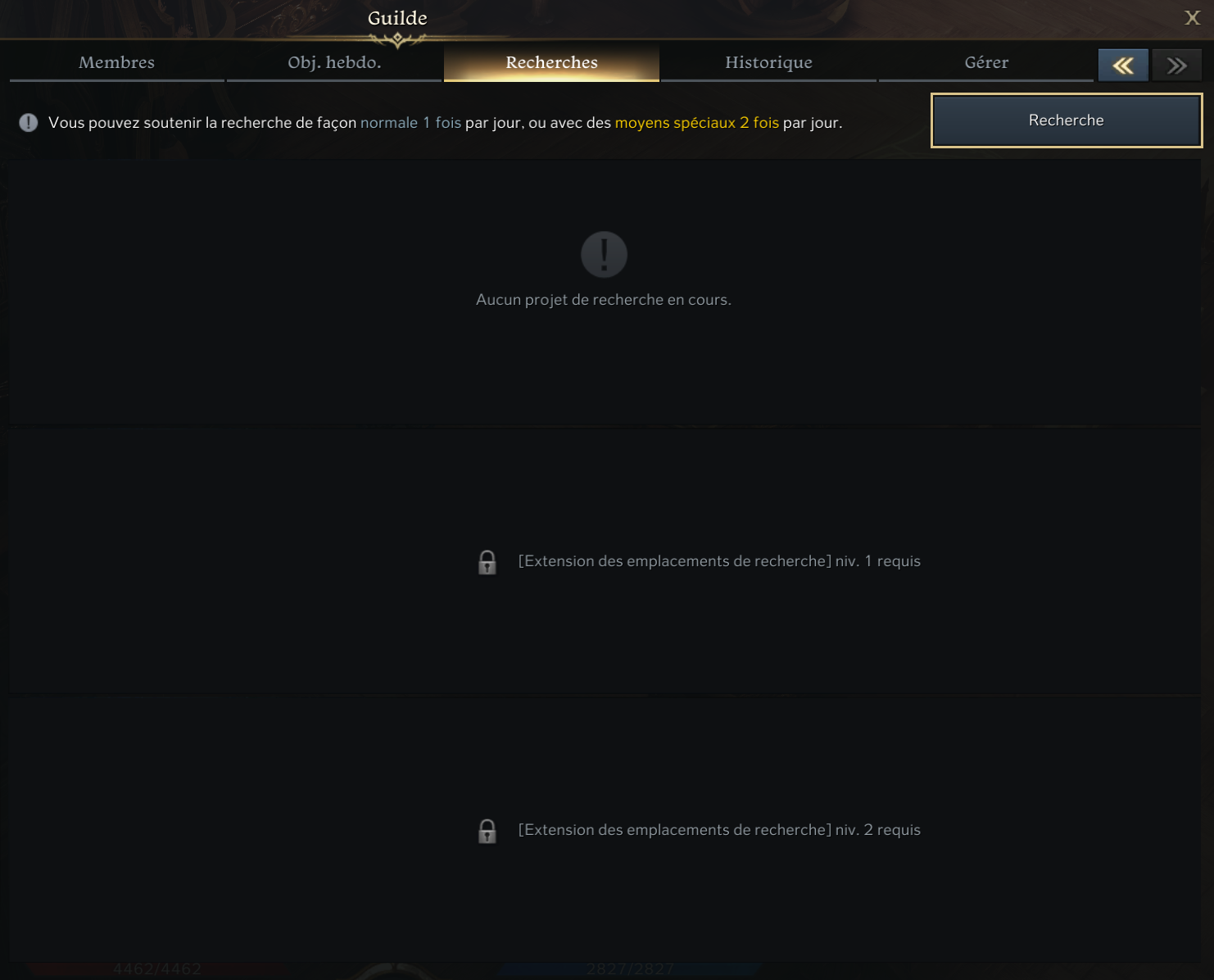 Le maître et les maîtres adjoints de la guilde peuvent effectuer les recherches nécessaires à la guilde.