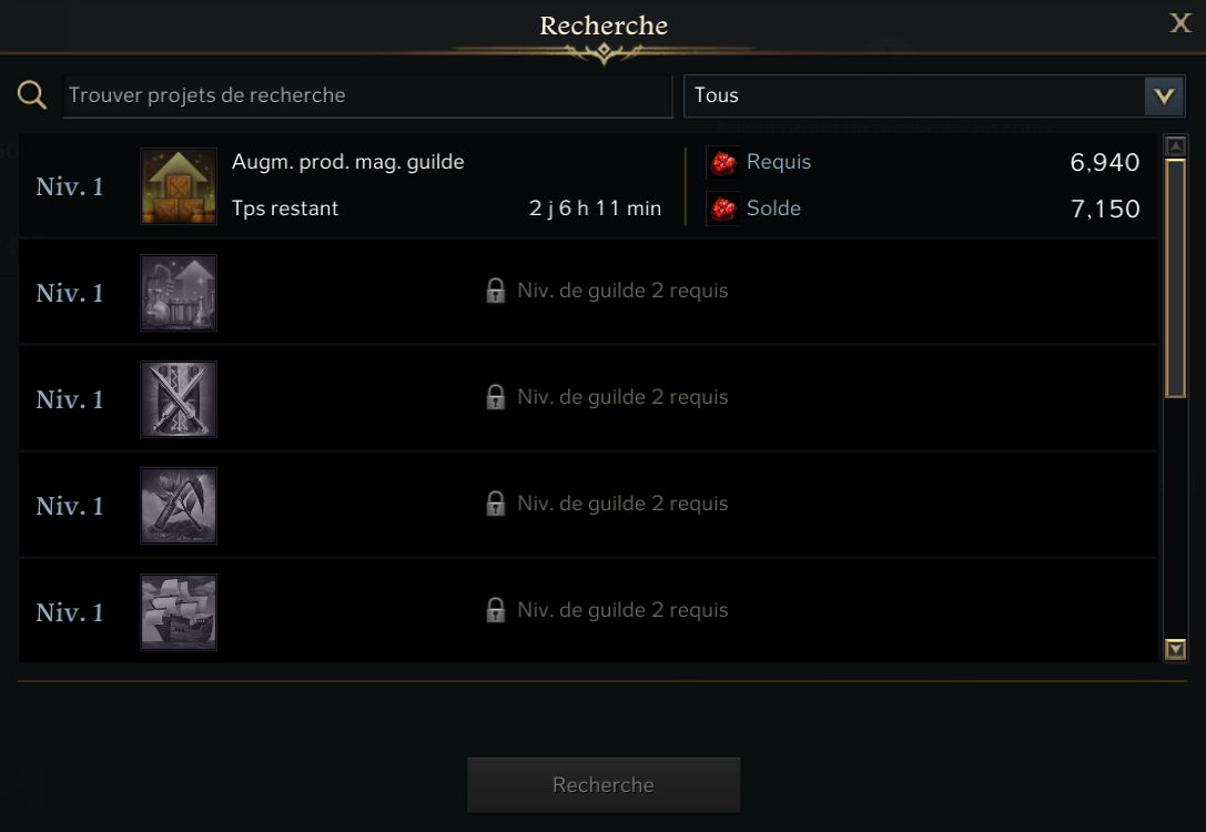 Les membres de la guilde peuvent soutenir les éléments de recherche en contribuant à l’activation des compétences ou à la croissance de la guilde.